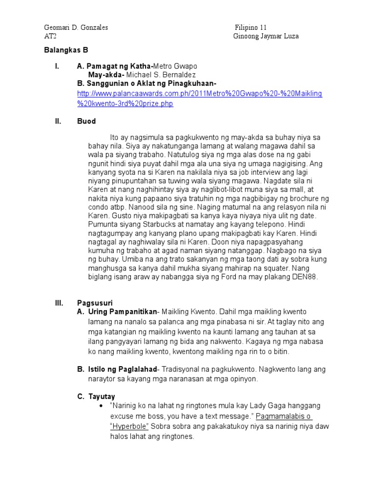 Maikling Kwento Na Proyekto Ni Geomari Metro Gwapo Pdf