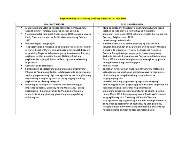 Paghahambing ng tauhan sa noli me tangere. Filipino 28102019 1728. Juan Crisostomo Magsalin Y Ibarra - binatang nag-aral sa Europa. EL FILIBUSTERISMO PAGHAHAMBING NOLI ME TANGERE EL FILIBUSTERISMO Inalay sa Inang Bayan Inalay sa GomBurZa dahil kay Paciano at Burgos ay nakapasok ng Ateneo si Rizal Nobelang panlipunan Nobelang pampulitika Labing tatlong 13 taon ang nasa pagitan ng Noli Me Tangere at El Filibusterismo Ano ang sala ng GomBurZa kaya sila pinatay ng mga Kastila.