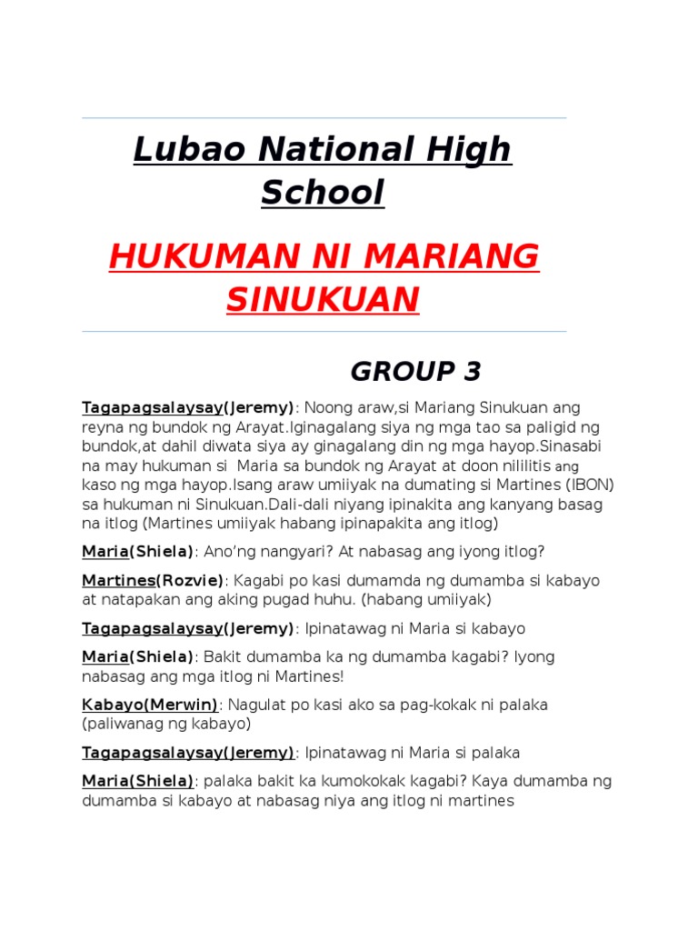 Sinukuan is associated with the unusual bounty of the. Isang araw umiiyak na dumating si Martines sa hukuman ni Mariang Sinukuan. 1 mga tauhan 2 tagpo 3 buod ng salaysay o ang pagkakasunod-sunod ng mga pangyayari 4 tema o paksa5 mensahe.