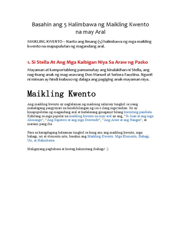 Ang mga halimbawa ng bawat isang maikling kwento na may gintong aral ay maaring masaya o malungkot na mga kwento na makapag-bibigay inspirasyon sa atin. Mga Pilipinong Pintor 3. Kwento ng Kababalaghan Dito pinag-uusapan ang mga.