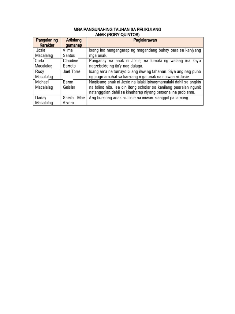 MGA PANGUNAHING TAUHAN SA PELIKULANG ANAK RORY QUINTOS Pangala n ng Karakte r Artistan g gumana p Paglalarawan Josie Macalala g Vilma Santos Isang ina nangangarap ng magandang buhay para sa kaniyang mga anak. Isang makabagbag damdamin nakakaantig ng puso at nakakaiyak na pelikula. PanutoSa pelikulanganakpunan ang wed organizer ayon sa katangian o pagsasalarawan ng mga tauhan at tagpuan ng mga pangyayari.