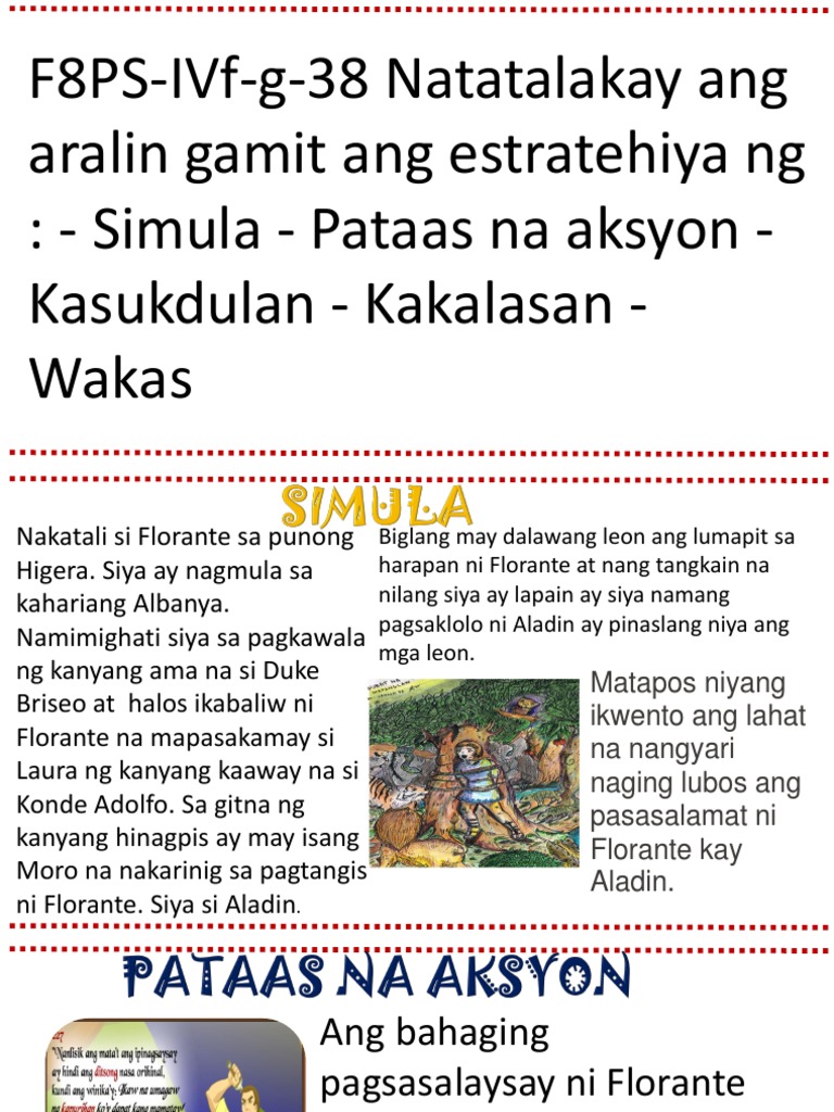 Mga tauhan florante at laura at pangyayari ppt. B Y FLORANTE AT LAURA 2 X g m 1 p PAGSAGIP SA PANGIL NG MGA LEON F SAKNONG 126-142 E 126 Sa tinaghuy-taghoy na kasindak-sindak gereroy hindi na napigil ang habag tinunton ang boses at siyang hinanap patalim ang siyang nagbukas ng landas. Panimula Isulat ang sumusunod na mga salita sa pisara at. - Simula - Pataas na aksyon - Kasukdulan - Kakalasan - Wakas Nakatali si Florante sa punong Biglang may dalawang leon ang lumapit sa Higera.