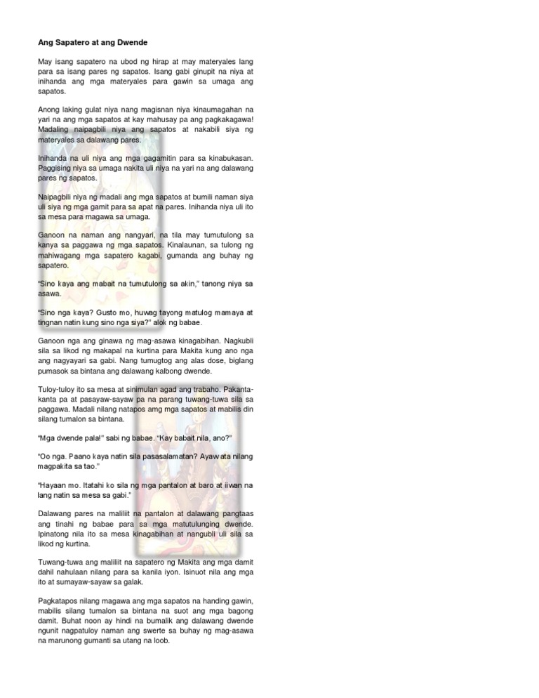 Ito ay kinapupulutan ng magandang aral at kadalasang ginagamit bilang kwentong pambata. Ang Sapatero at mga Duwende Buod Isang araw may isang mahirap na sapatero siya ay may materyales nna para lamang sa isang pares ng sapatos.