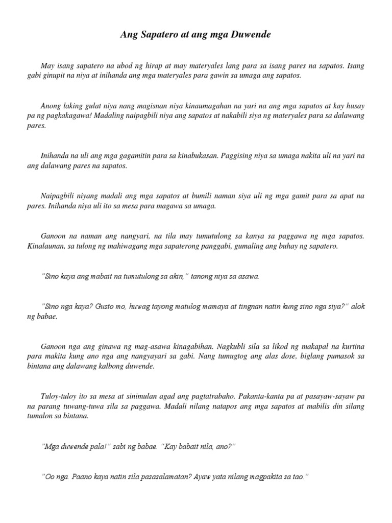 Isang araw may isang mahirap na sapatero siya ay may materyales nna para lamang sa isang pares ng sapatos. Buhat noon hindi na bumalik ang dalawang dwende ngunit nagpatuloy. This is the example of short stories about a tale story for animals in tagalog version.
