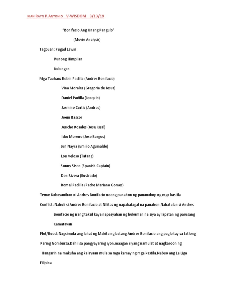 With Robin Padilla Vina Morales Eddie Garcia Jericho Rosales. Ang kabuuang mensahe ng Bonifacio ang Unang Pangulo ay noong pa man ay may siraan na sa bansang Pilipinas na mas nanaig ang politika at ang kanilang mga kapangyarihan na kahit. Andres Bonifacio known as Supremo is the leader of the Katipuneros who revolt against the Spaniards during 1800s.