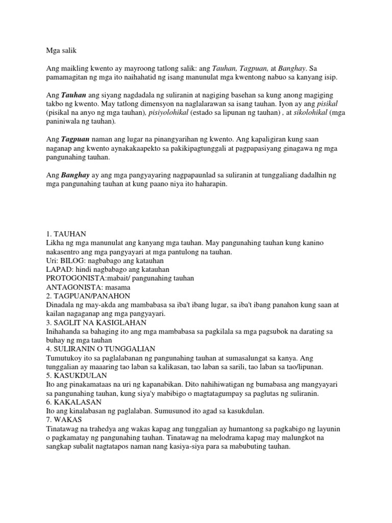 Mga Salik ng Maikling Kwento. Sa gitna ng maikling kwento ang lubusang pagtalakay sa suliranin ng mga tauhan. Ang maikling kuwento - binaybay ding maikling kwento - ay isang maiksing salaysay hinggil sa isang mahalagang pangyayaring kinasasangkutan ng isa o ilang tauhan at may iisang kakintalan o impresyon lamang.