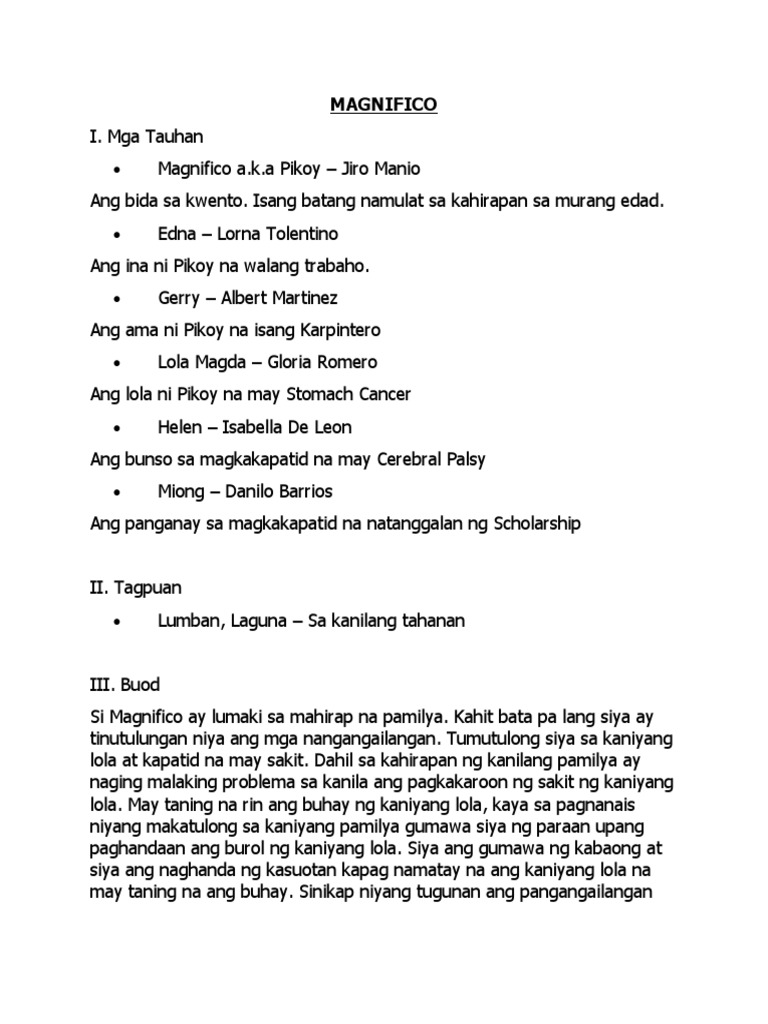 1 mga tauhan 2 tagpo 3 buod ng salaysay o ang pagkakasunod-sunod ng mga pangyayari 4 tema o paksa5 mensahe 6. Danilo Barrios- Kapatid na panganay ni Magnifico. Si Magnifico ay lumaki sa mahirap na pamilya.