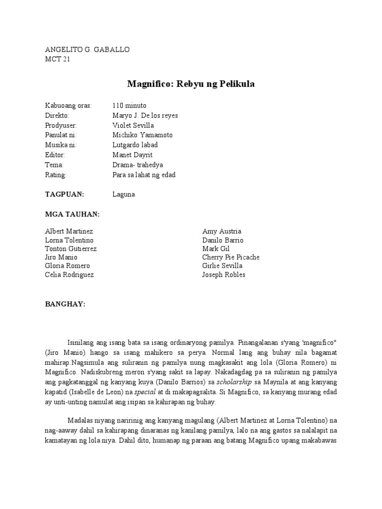 Ito ang diyalogo o pag-uusap ng mga tauhan na binibigyang buhay ng mga aktorAng dula ay binubuo ng mga sumusunod na elemento. Pagsusuri sa bawat pangyayari mga aral mga tauhan sa pelikula at maging ang pagsisiwalat sa kahalagahan ng pelikulang ito. De los Reyes ang direktor ng pelikulang kinabibidahan nina Albert Martinez Lorna Tolentino at Jiro Manio bilang Magnifico.