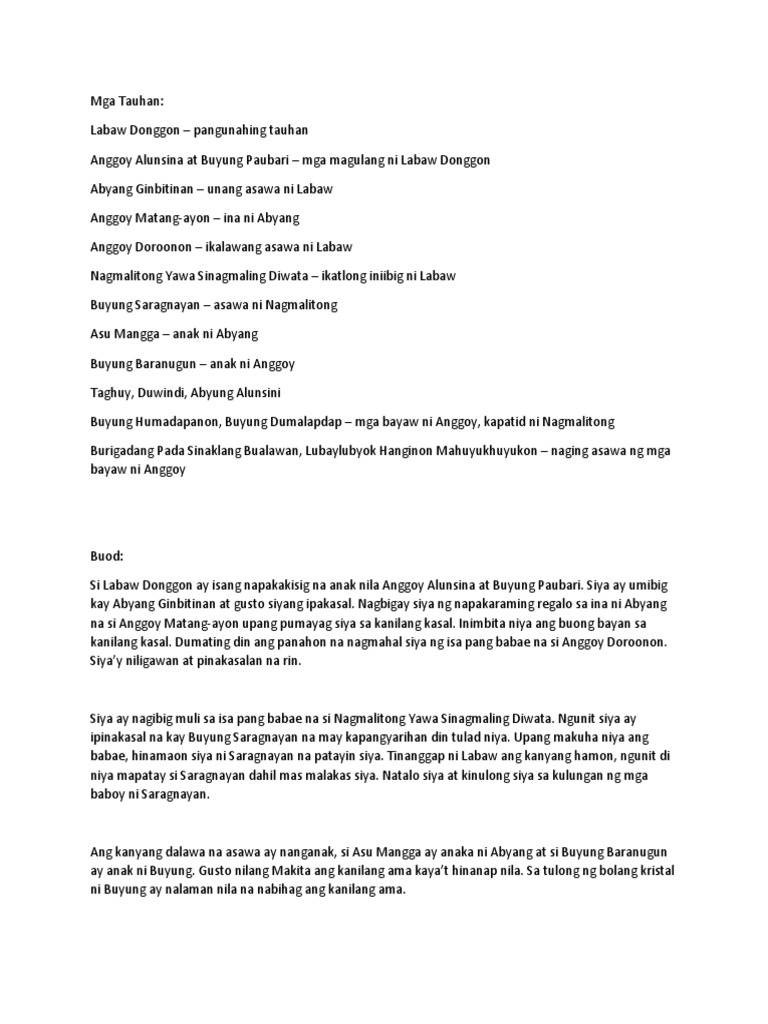 Siya ay isa sa mga anak nina Anggoy Alunsina at Buyung Pabauri. Pagkalipas ng ilang araw napansin rin niyang may mga ugat na tumutubo sa. View Labaw Donggon 2019 Autosavedpptx from FIL.